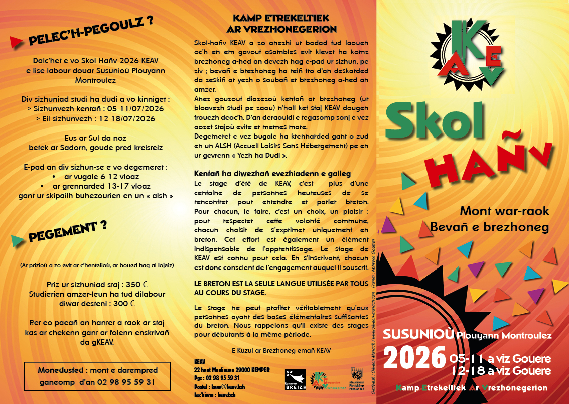 Staj KEAV a zo ur bodad tud laouen oc’h en em gavout asambles evit klevet ha komz brezhoneg a-hed an deiz hag e-pad ur sizhun, pe div, evit bevañ e brezhoneg hag evit reiñ tro d’an deskarded da zeskiñ brezhoneg ha da vevañ er yezh a-hed ar sizhun..